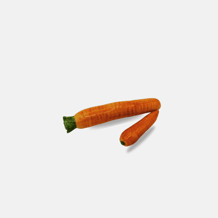 Las zanahorias de cerámica artesanal italiana capturan con precisión la textura y el color natural, aportando un toque de frescura rústica.