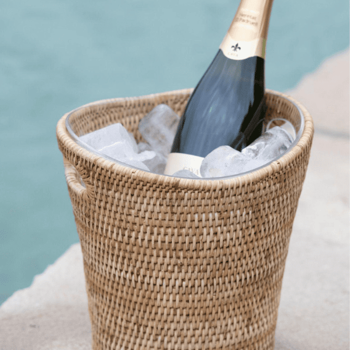 Para tus eventos de verano, no puede faltar esta champanera hecha a mano en ratán claro. Con una capacidad para 5L pueden meterse varias botellas a enfriar. Incluye soporte de fibra de vidrio para poner los hielos.