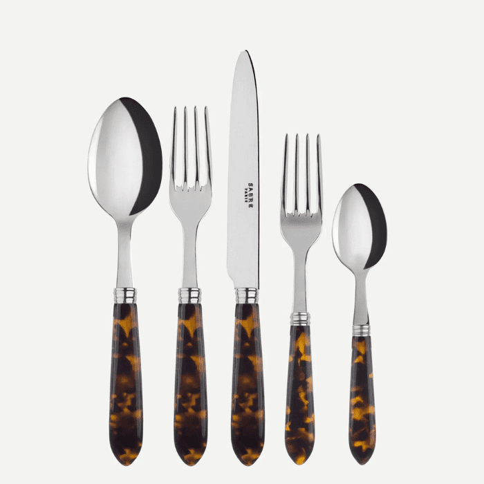 6 cucharas mesa, 6 tenedores mesa, 6 cuchillos mesa, 6 tenedores postre y 6 cucharas té. La colección Tortue se compone de una forma de mango clásico, con un diseño original pero elegante con su efecto caparazón de tortuga. Es la combinación perfecta si quieres un toque de originalidad y sencillez en tu cubertería de diario o para ocasiones especiales .