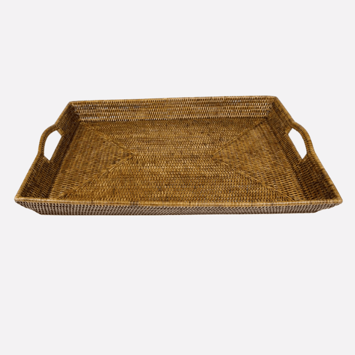 Bandeja grande con asas realizado en ratán. Ideal para lucir en aperitivos o para servir la mesa.