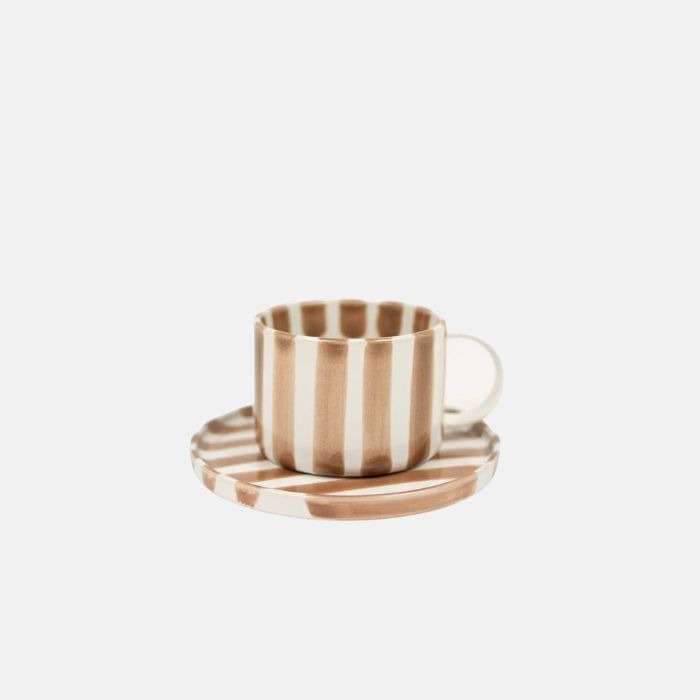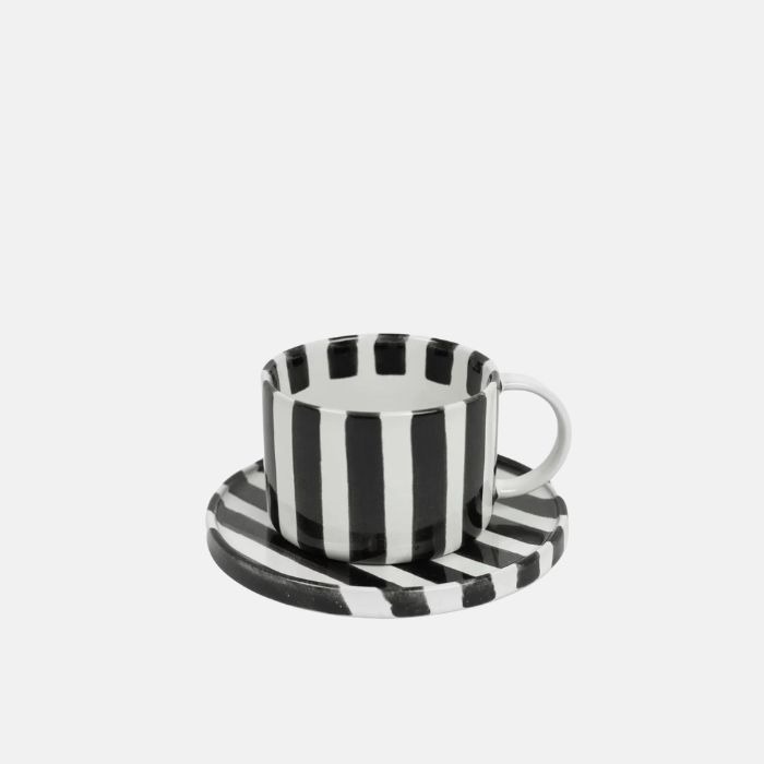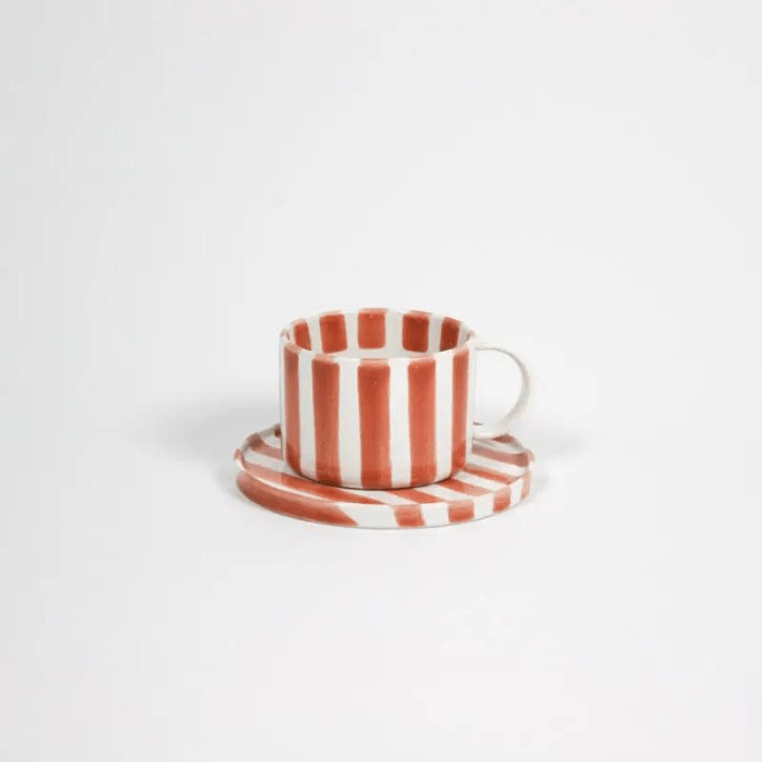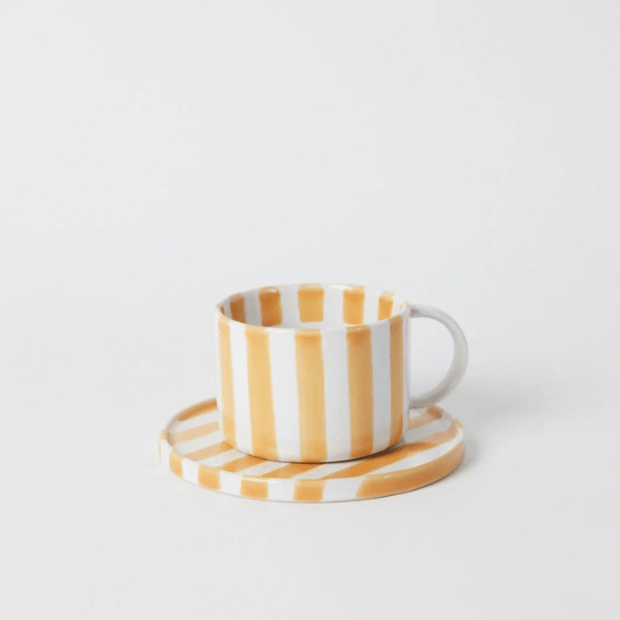 Taza con platito con rayas. Disponibles en diferentes colores.