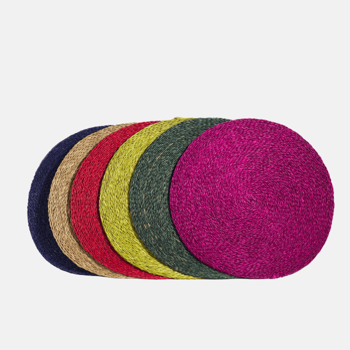 Individuales tejidos a mano con fibra natural local por artesanas de Eswatini, África. Los colores están inspirados en los de esa zona en concreto que hacen de estos individuales piezas únicas para nuestras mesas.