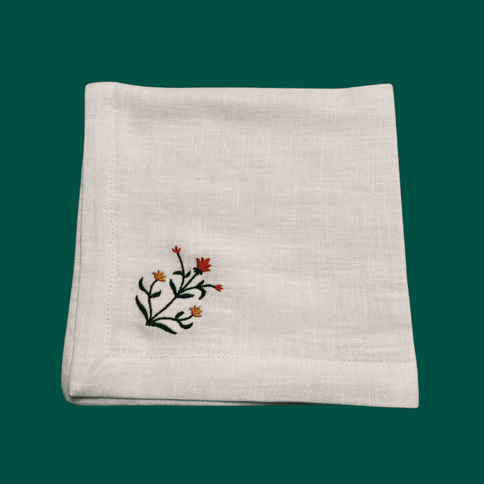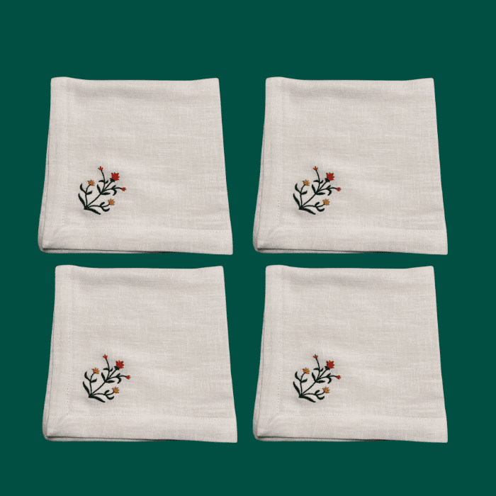 Servilletas atemporales que juegan con la flor diseñada en la colección de Navidad del cuento de Belén. Combínalas con el individual o con el mantel. O con cualquier otro mantel que tengas en casa. Servilletas bordadas con flores
