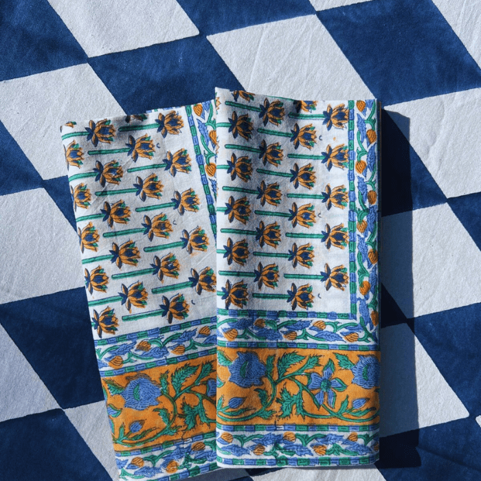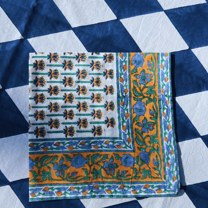 Se venden en set de 6 unidades, estampado de flores con tonos azules y anaranjados. Van a juego con el mantel de India de rombos azules