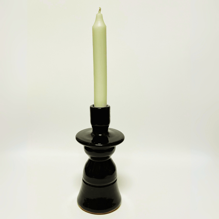 Elegante candelabro negro con base para evitar que caiga la cera de las velas. Hecho artesalmente siguiendo la tradición de la cerámica marroquí. Al ser un producto 100% artesanal puede haber variaciones de color y de tamaño que los hacen únicos.