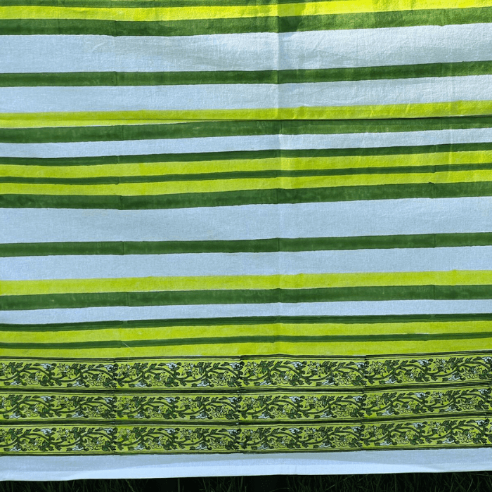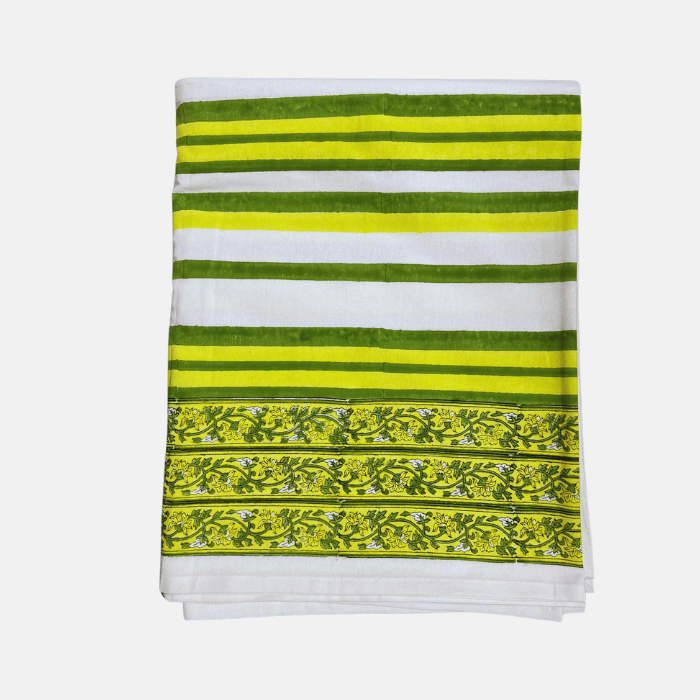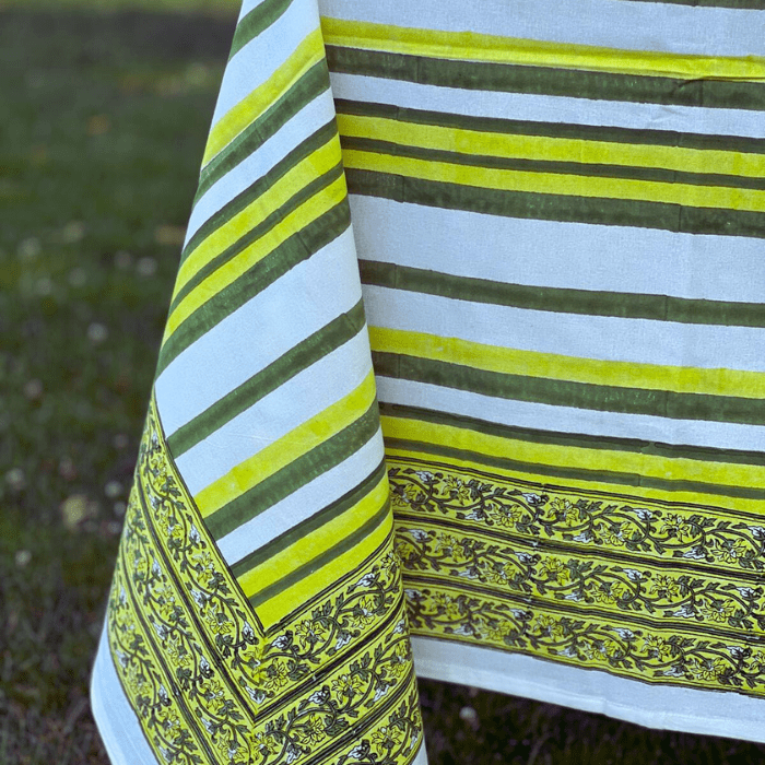 Mantel 100% algodón con estampado con rayas y ramas en tonos verdes y lima. Un mantel fresco y original para cualquier mesa.