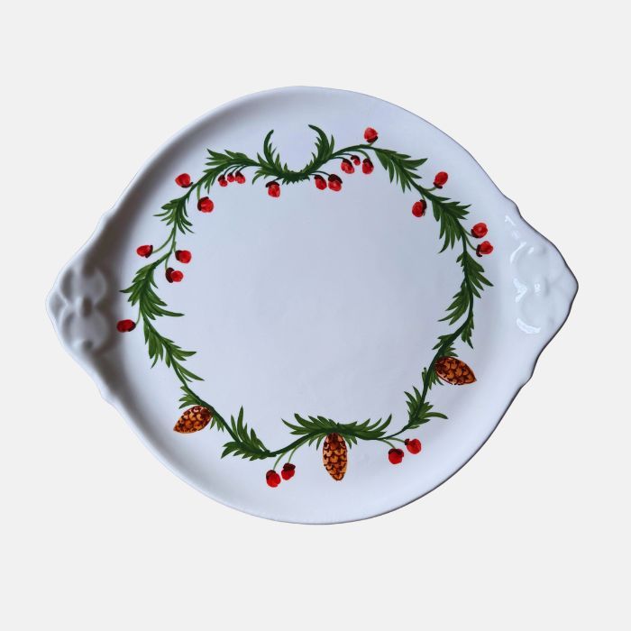 Fuente redonda pintada y hecha a mano en nuestro taller de Portugal. Ese toque navideño es ideal para presentar tartas, paltos de embutidos o turrones. Una pieza unica. Al ser pintado a mano no todas son igual, lo cual hace que cada una sea unica.