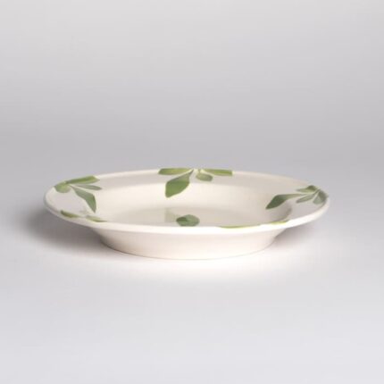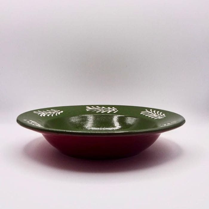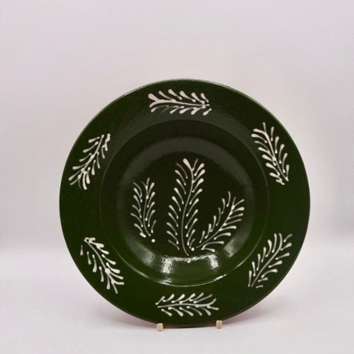 El diseño de esta vajilla esta realizado por Mana Briz, fundadora del Almacén de loza .Eligió este diseño realizado en nuestro taller de Extremadura para una cena en honor a la artesanía española. Los platos son de barro esmaltado. Tienen un encanto rústico para unas mesas inolvidables