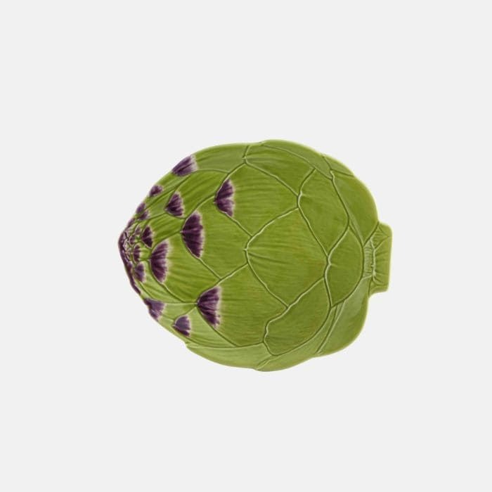 En platos llanos con forma de alcachofa pintados a mano de la conocida casa portuguesa Bordallo Pinheiro. La colección Alcachofa es una de las nuevas colecciones que mejor esta funcionando porque mezcla muy bien con todo tipo de vajillas.