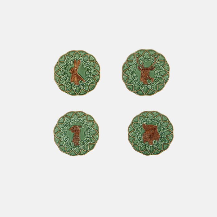 Platos de pan con temática de animales del bosque. Vajilla pintada a mano de la conocida casa portuguesa Bordallo Pinheiro. La colección Bosque es una de la más vendidas para las mesas más campestres. 4 modelos diferentes