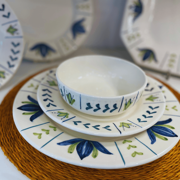 Vajilla diseñada en colaboración con la pintora y artista Andrea Zarraluqui. Realizada en nuestros talleres de Portugal. Cada plato es único, se fabrican y se pintan uno a uno siguiendo la tradición de alfarera local. Al ser un producto artesanal el color puede variar a veces entre plato.