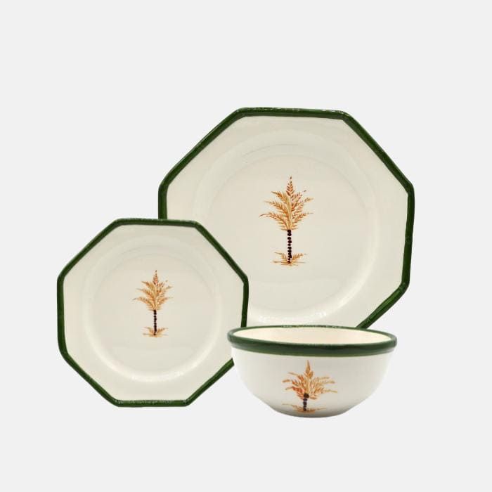 Vajilla fabricada y pintada a mano en nuestro taller de Portugal. El diseño está inspirado en las palmeras de Marruecos, con esa mezcla del ocre con el verde. La puedes combinar con la vajilla bambú verde.